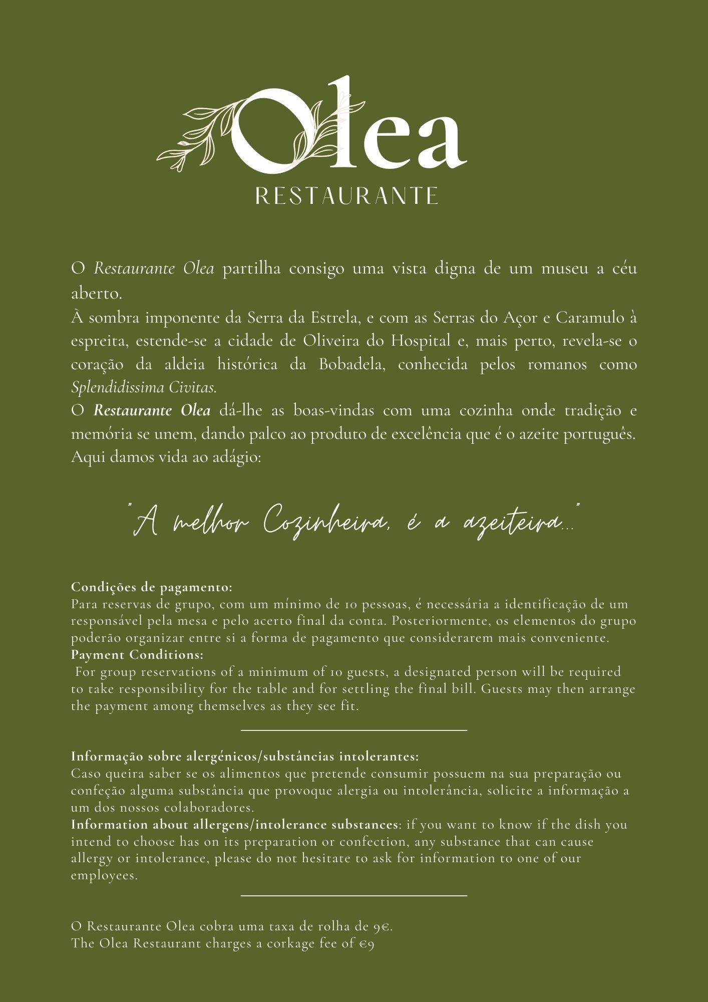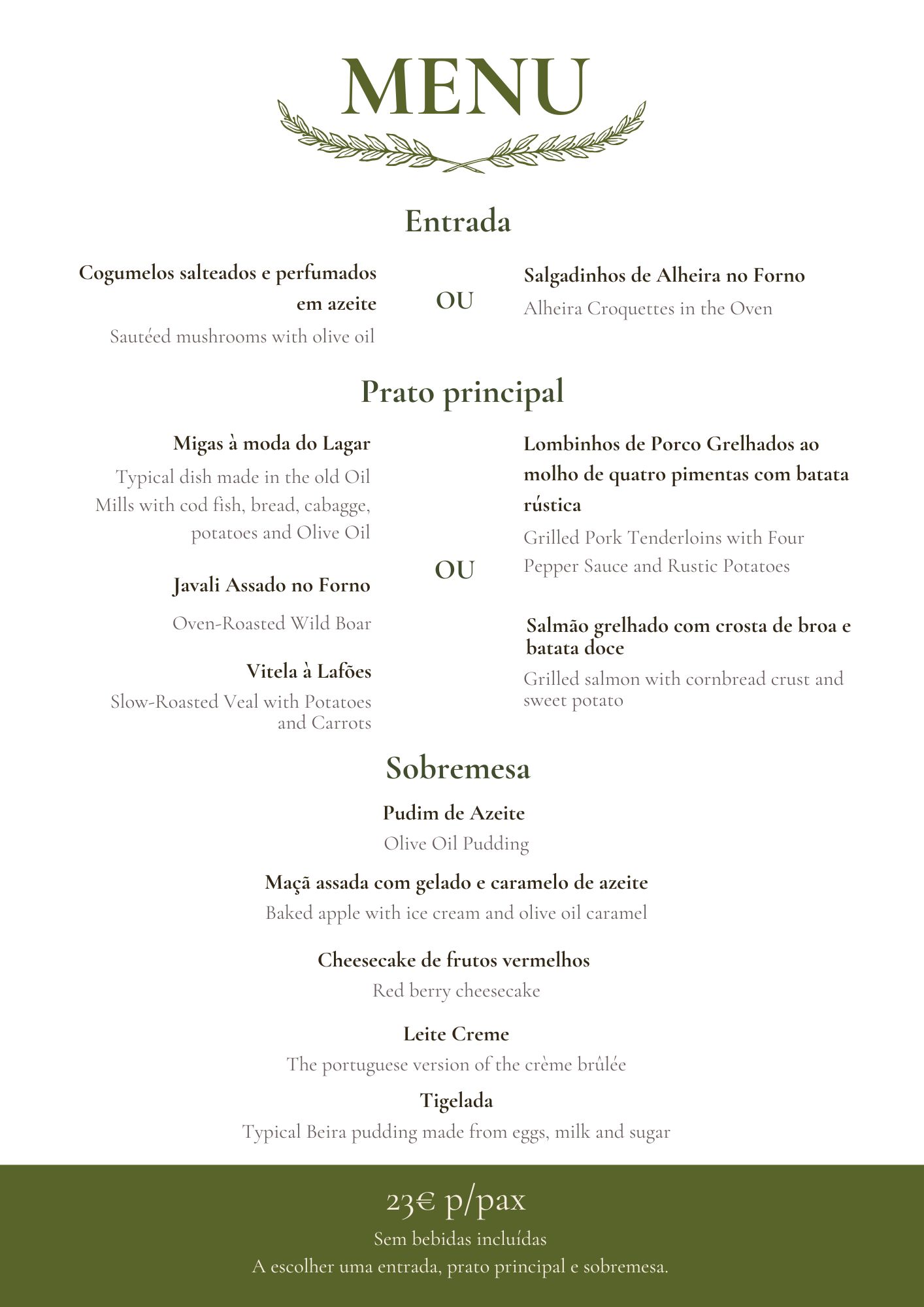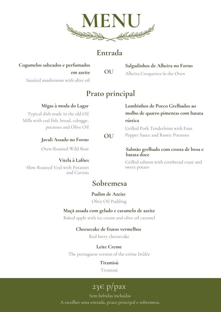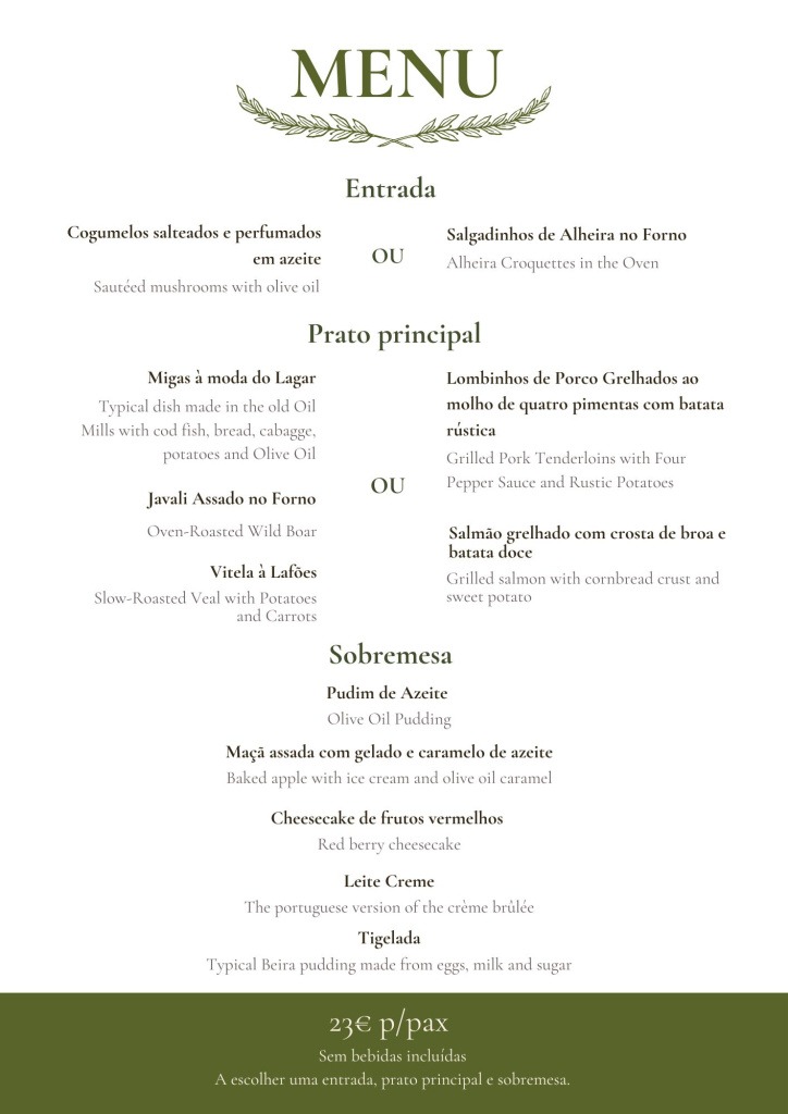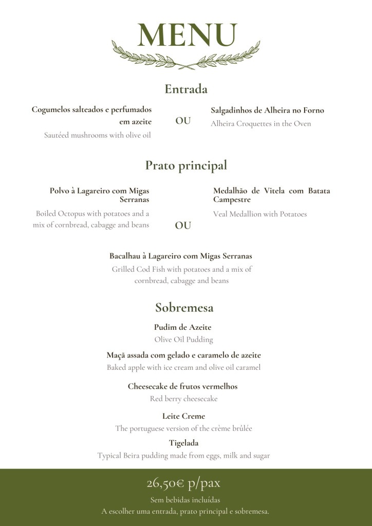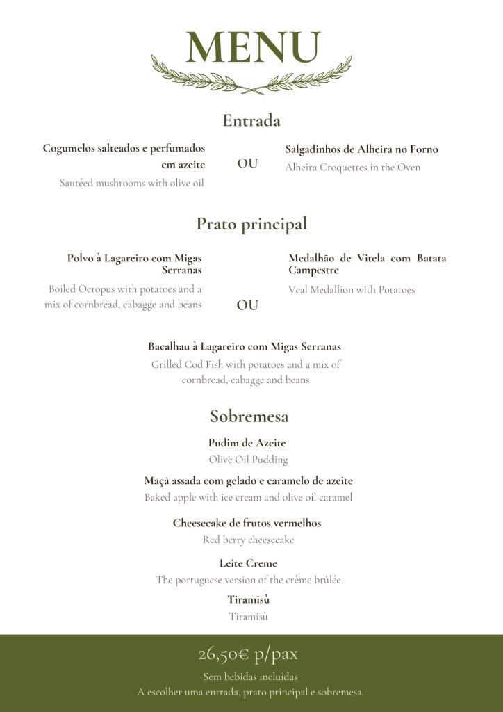 Este espaço museológico é ainda constituído pelo Restaurante “Olea”, um espaço com muita luz natural e vista panorâmica sobre a Serra da Estrela, onde o sabor, a qualidade e o serviço marcam a diferença. Do “Bacalhau à Lagareiro” ao “Javali Assado no Forno”, passando também pelas Tigeladas da Beira Interior e pelo nosso exclusivo Pudim de Azeite, a aposta na recriação de pratos típicos e a inclusão de produtos endógenos é facilmente percetível.