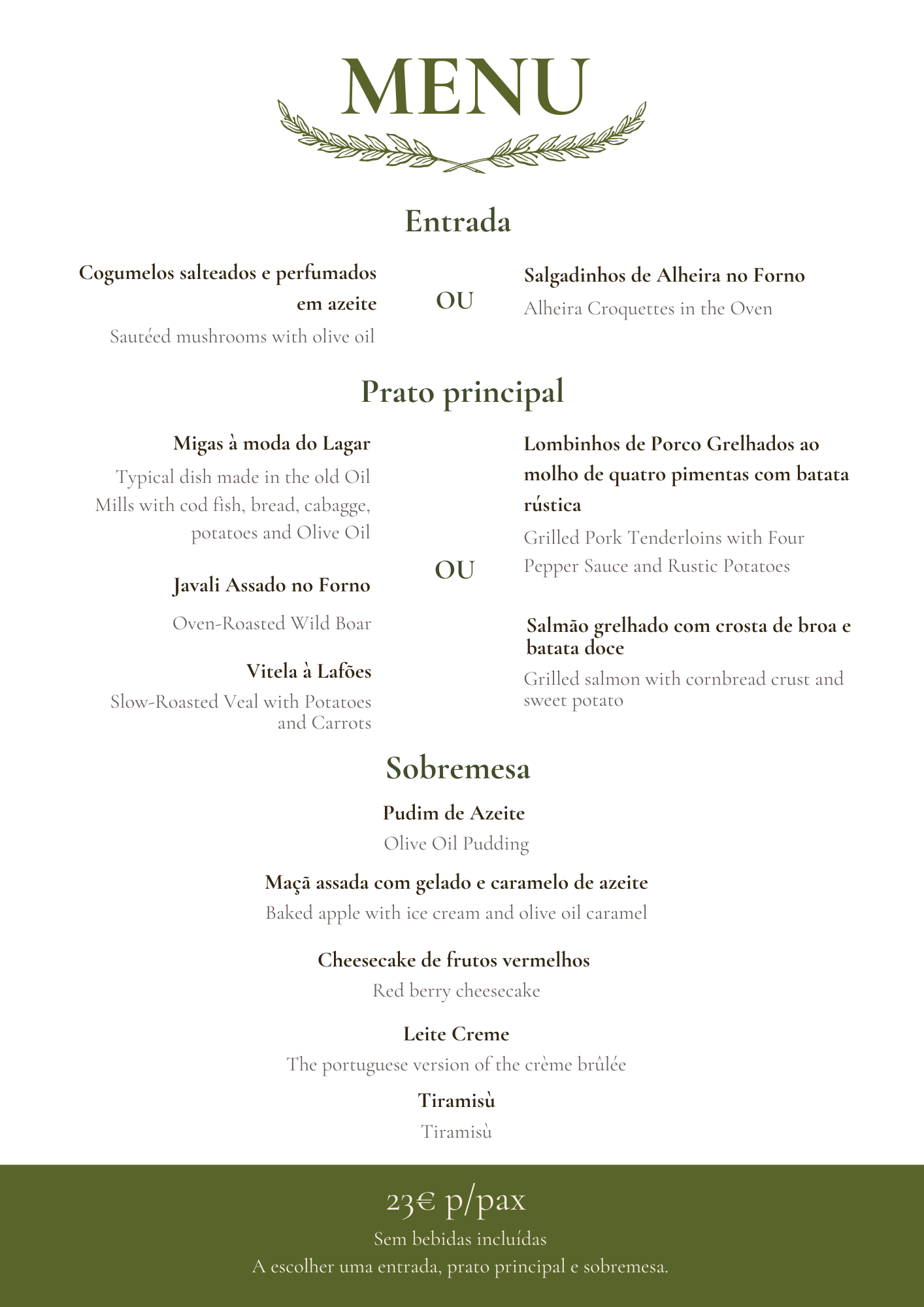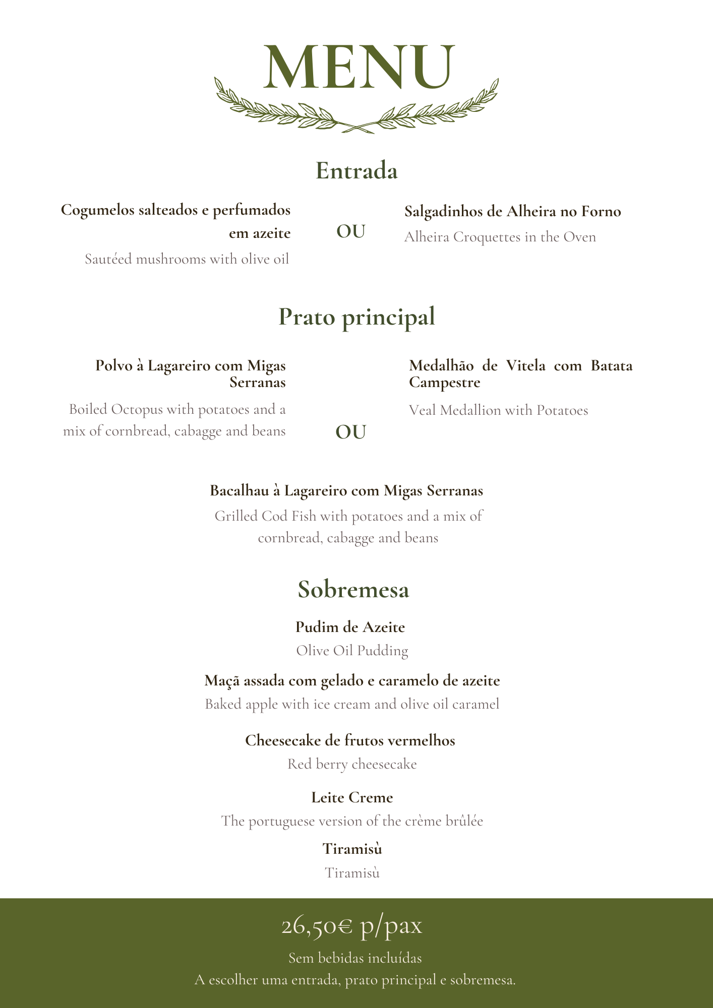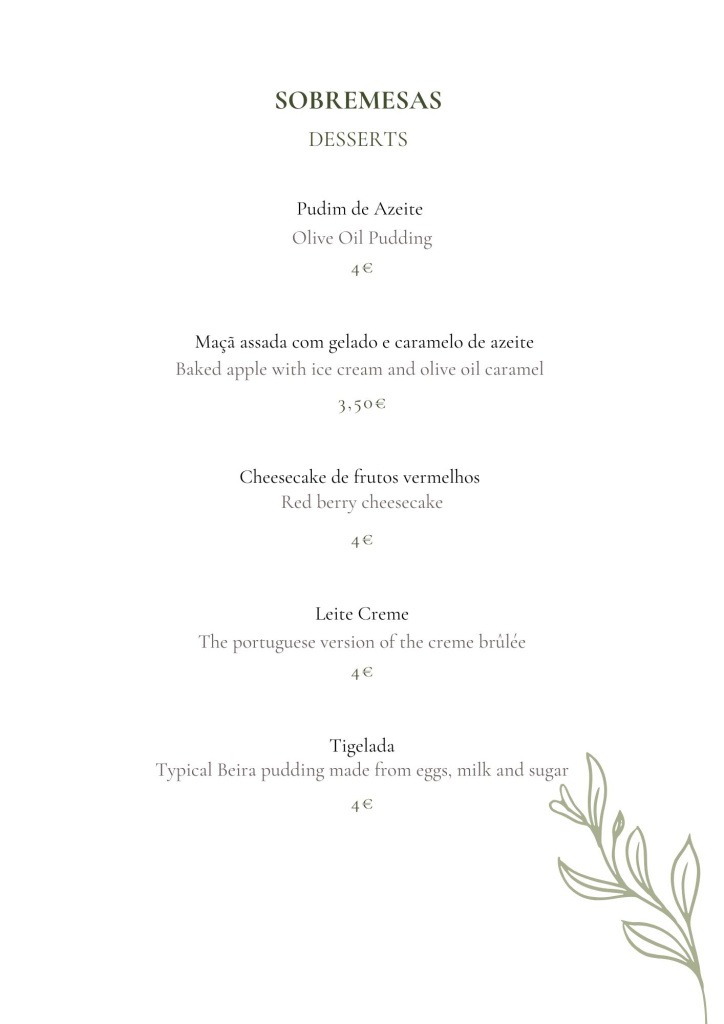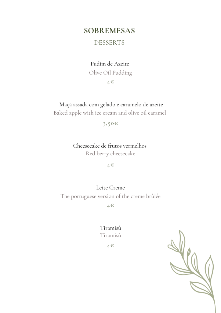 No “Olea” o azeite e a azeitona são obrigatórios em todos os pratos, assim como uma variedade de vinhos das diferentes regiões vitivinícolas de Portugal.
